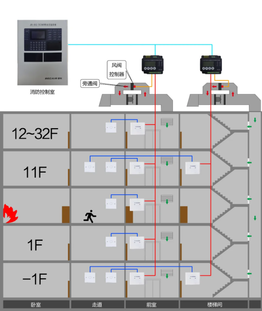 在消防行业,一般是通过余压探测器来时刻监控楼梯间与前室之间的气压差,根据差值大小来控制风机给楼梯间或前室的送风量,使楼梯间的气压始终高出前室气压一定范围内。阻止烟雾扩散,顺利打开逃生门,且在逃生过程中迟可能不因过多烟雾吸入,保护人员安全;