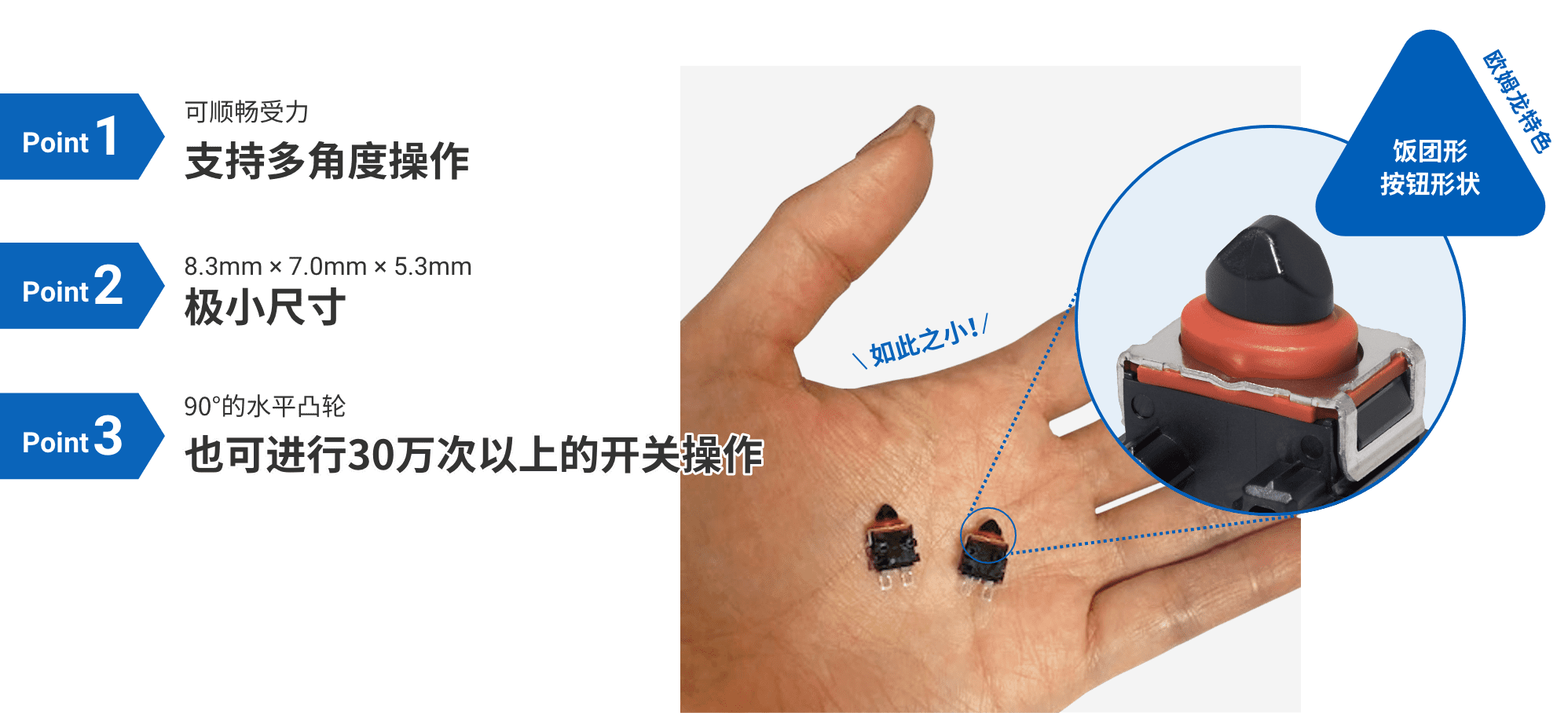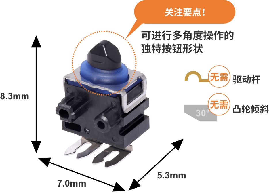实现(1)和(2)最简单的方法就是从正上方按压,也就是从行程(完全按下开关的距离)最短的角度按压。但要设计行程只有几毫米的超微小型开关的垂直按压并不容易。