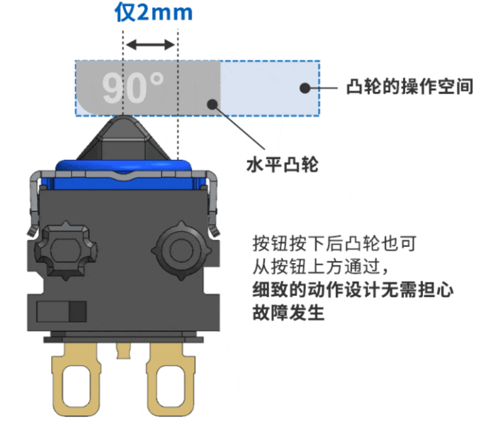 由于无驱动杆,水平凸轮只需最小的移动即可完全按下按钮,因此有助于节省空间。