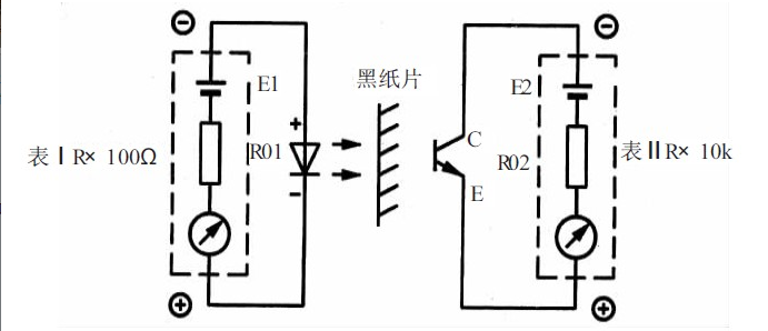 检测原理:接通电路后,发射管即发出红外线,接收管则产生光电流,使c-e 极间电阻从无穷大降至几百千欧。当黑纸片挡住红外线时,接收管就无光电流,电阻值迅速增大。因此上、下抽动黑纸片,可不断改变表Ⅱ的读数,观察到指针的摆动。