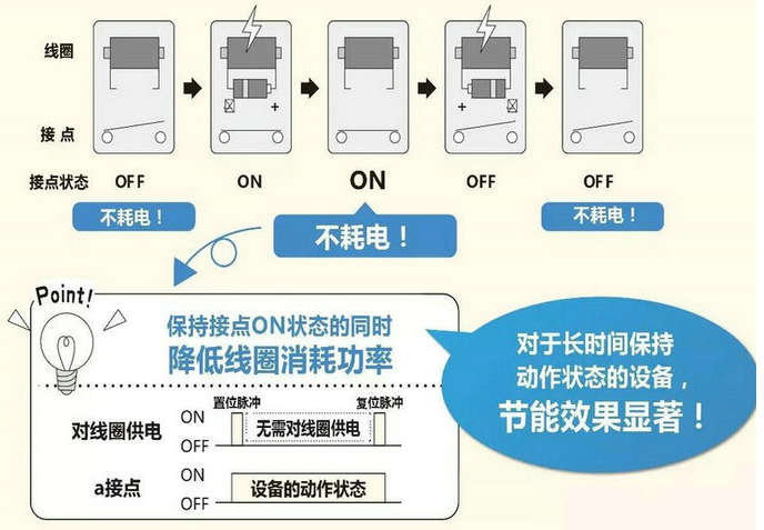 锁定功能:在施加线圈电压时将接点置ON或OFF即使断开线圈电压依然保持该状态的功能。在设备的动作状态下降低线圈消耗功率,为节能作出贡献。