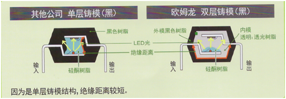 欧姆龙MOS FET继电器高绝缘型虽然采用了黑色树脂,但由于是双层铸模构造,因此可确保较长的绝缘距离,实现了高绝缘性。DIP、SOP系列产品新增黑色封装,DIP:支持AC5000V;SOP:支持AC3750V