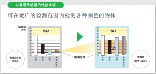 与普通传感器的性能比较,欧姆龙可在宽广的检测范围内检测各种颜色物体