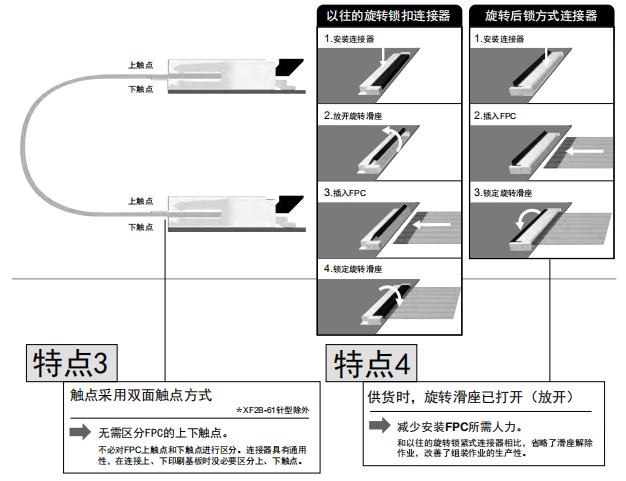 在移动终端、便携设备等领域高速发展的背景下,产品市场已经越来越趋向于小型化。同时,功能模块的高度集中和传输信号的日益增多,迫切需要端子间距更小、更薄、更轻便的连接解决方案。欧姆龙推出FPC/FFC连接器XF3M,帮助您解决小型化需求。采用旋转反锁方式,轻松操作,减少工时。而且产品种类丰富,为您提供更多选择。