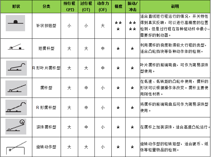 每个系列产品按照驱动杆、额定值、接触规格、端子规格、动作力等分为多种类型,今天就带大家了解下欧姆龙微动开关的驱动杆有哪些?区别是什么?要如何进行选择?详情请查看下图:
