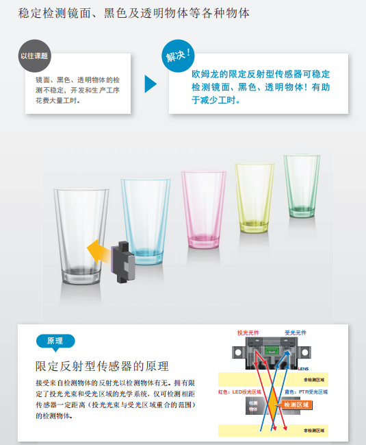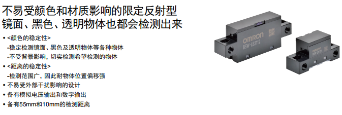 对于玻璃机械来说,欧姆龙检测有无的光电传感器B5W-LB2112-1拥有着绝对优势。欧姆龙传感器抗阳光干扰强,可稳定检测镜面、黑色、透明物体,接受来自检测物体的反射光以检测物体有无,拥有限定了投光光束和受光区域的光学系统,仅可检测相距传感器一定距离(投光光束与受光区域重合的范围)的检测物体。