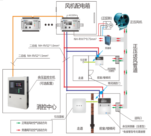 2, 余压监控系统通过余压探测器实时监测余压值(前室/走道或楼梯间/走道气压差值), 当余压值超过报警设定值(前室30Pa, 楼梯间50Pa),余压探测器将发出报警信号,同时联动余压控制器控制旁通阀开启,减少正压风机前室或楼梯间的送风量,降低前室或楼梯间余压值。