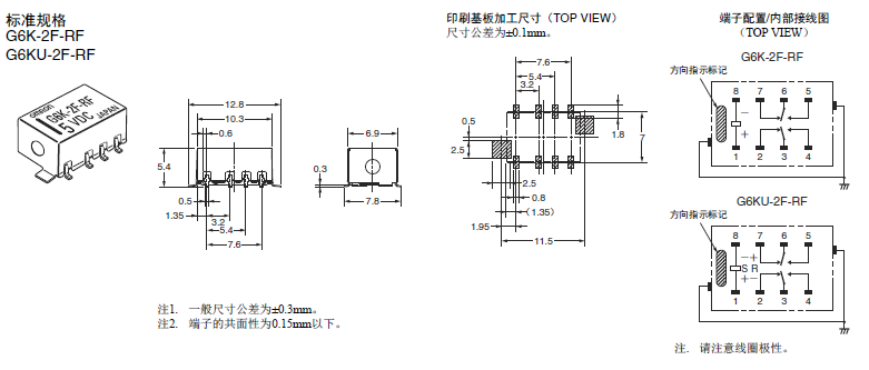 | 单稳型 | 塑料密封型 | DPDT(2c) | DC 3, 4.5, 5, 12, 24 | G6K-2P-RF | 30件/根 |