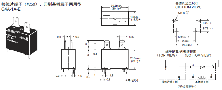 G4A 功率继电器 实现通电80A、通电、切断20A的1极小型功率继电器 ▶ 实现通电80A、通电、切断20A的电机负载开闭。小型却可以实现高容量开闭、高耐久性。 ▶ 符合UL、CSA空调规格,确保绝缘距离。 ▶ 采用抗干扰性强的高绝缘构造。 ▶ 标准品采用耐焊剂构造。 通电80A、通电、切断20A的1极小型功率继电器