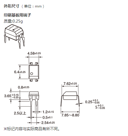 * 连续负载电流 (最大)、 负载电压 (最大) : 表示峰值AC、 DC。 注1. 带状包装(表面安装端子型) 无标准在库机种。 注2. 带状包装(表面安装端子型) 的订货请在型号末尾加上(TR) 或(TR05)。 |