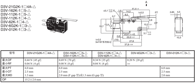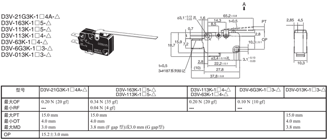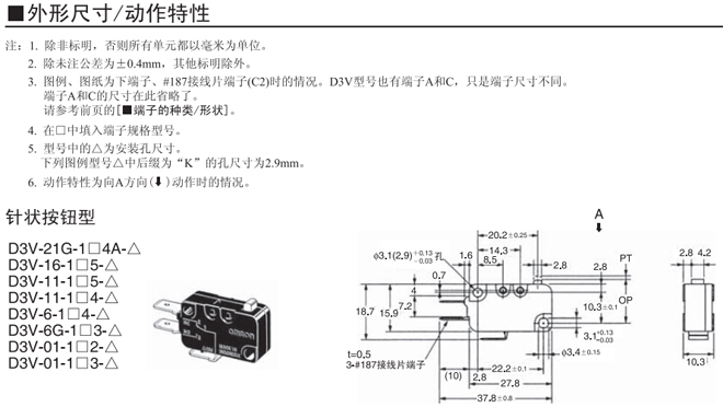 | 针状按钮型 | --- | 1.23N {125gf} | D3V-21G-1□4A-△ | D3V-21G-2□4A-△ | D3V-21G-3□4A-△ |