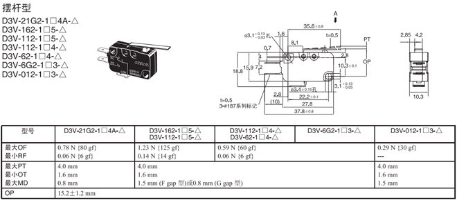 | 摆杆型 | 内部安装 | 1.23N {125gf} | D3V-162-1□5-△ | D3V-162-2□5-△ | D3V-162-3□5-△ |