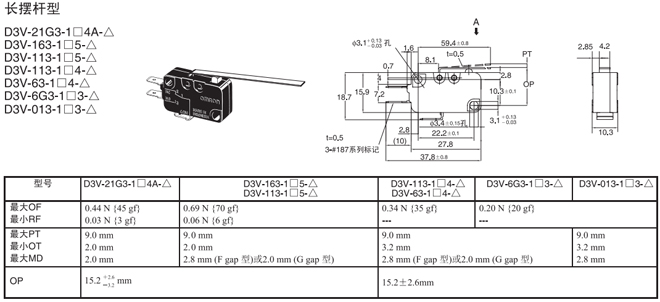 | 长摆杆型 | 内部安装 | 0.69N {70gf} | D3V-163-1□5-△ | D3V-163-2□5-△ | D3V-163-3□5-△ |