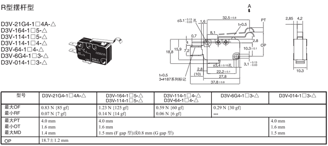 | R型摆杆型 | 内部安装 | 0.83N {85gf} | D3V-21G4-1□4A-△ | D3V-21G4-2□4A-△ | D3V-21G4-3□4A-△ |