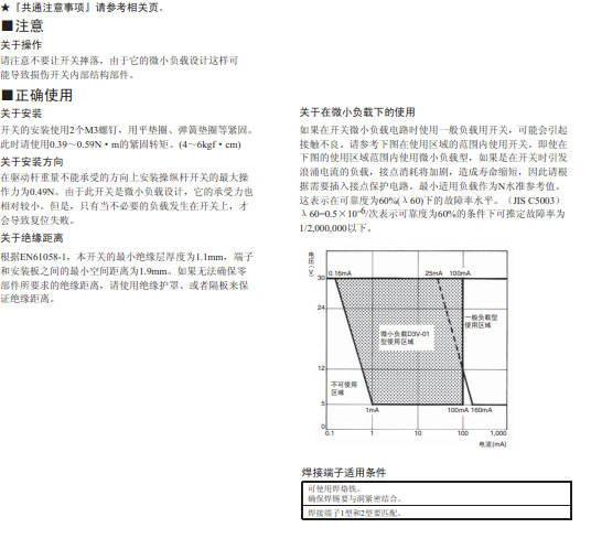 | 注:1.次数值为标准规格的节点间隔1mm(F Gap)的电流常熟,节点间隔为0.5mm(G Gap)的场合,定格多少有所不同,请充分注意。 |