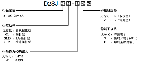 D2SJ-5 超小型基本开关 高安全而又可靠的超小型基本开关 外形尺寸与SS系列相同。 适应未来市场需求。 备有5A型产品。