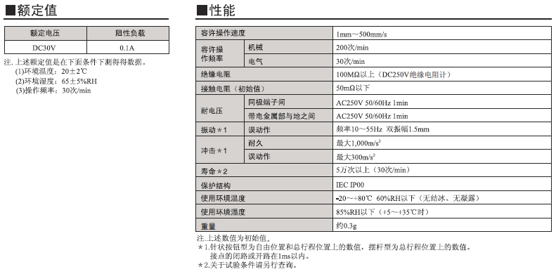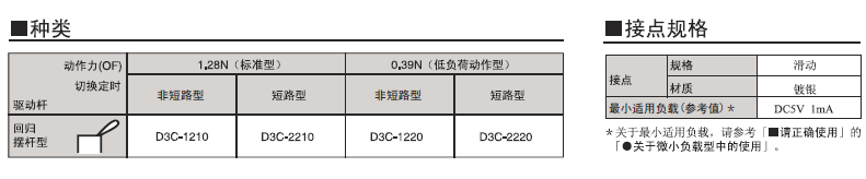 D3C 超级小型检测开关 采用滑动式的超小型开关 超小型(高6×宽8×深4.2mm),轻量(约0.3克),3mm的长行程。 由于是滑动方式,所以短路、非短路的切换时间可根据使用用途进行选择。