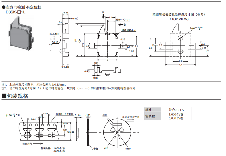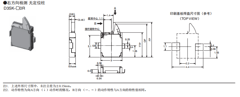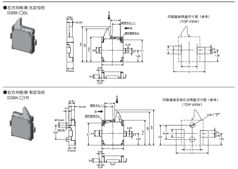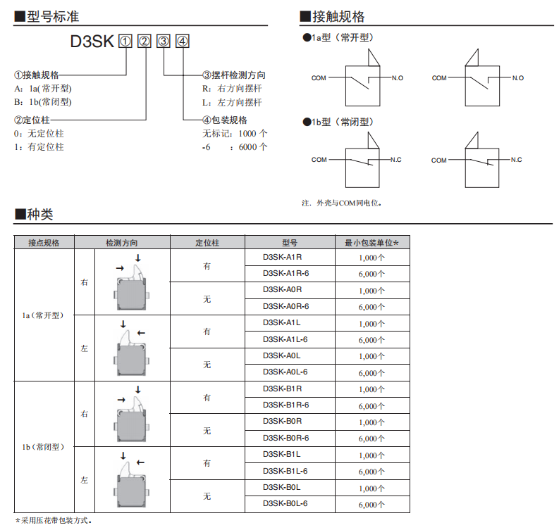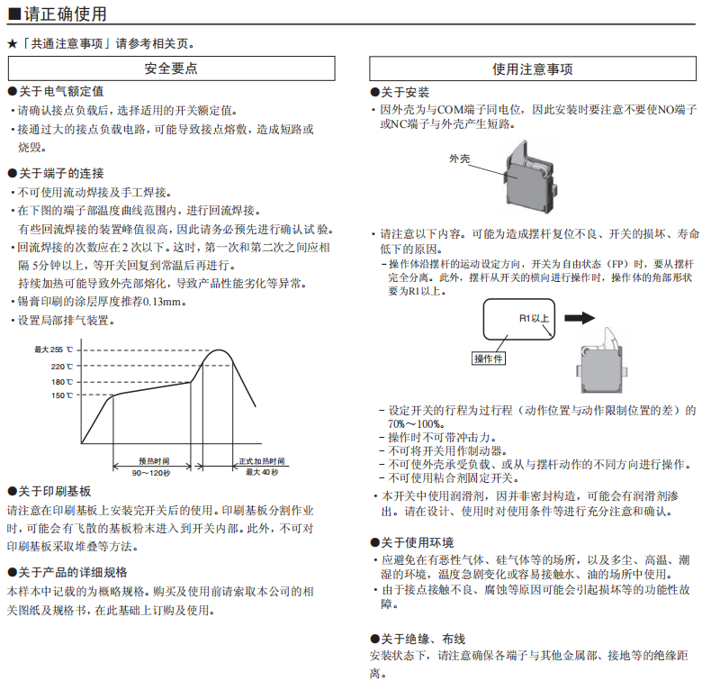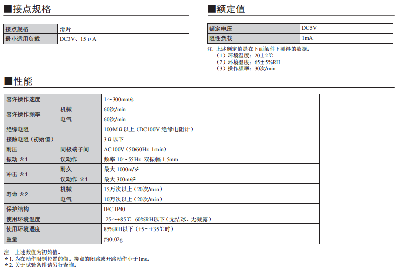 「社内较小级」可实现高精度动作的检测开关 (宽3.0mm×长3.5mm×厚0.9mm) 小型及薄型,为机器的小型化、薄型化作贡献。 特定的接点机构,实现了高精度的动作位置及高可靠性的接触。 长行程提高了使用的便捷性。 接触规格(1a、1b)及多种摆杆,可适合范围宽广的各种用途。