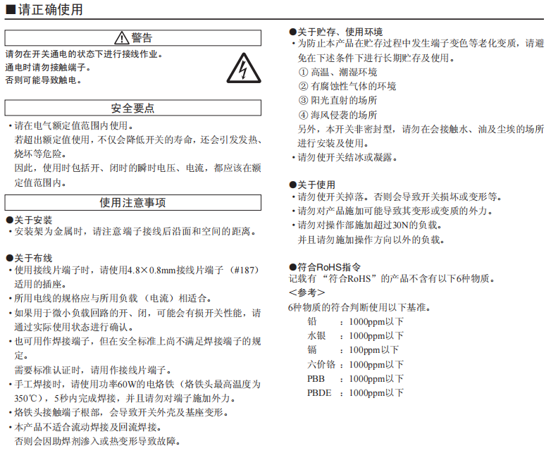 接点间隔3mm以上的小型电源开关 采用特定的速断机构,可进行功率负载开、闭。开、闭利落、良好的操作感。 确保接点间隔3mm以上。 符合UL、cUL标准、符合EN标准。