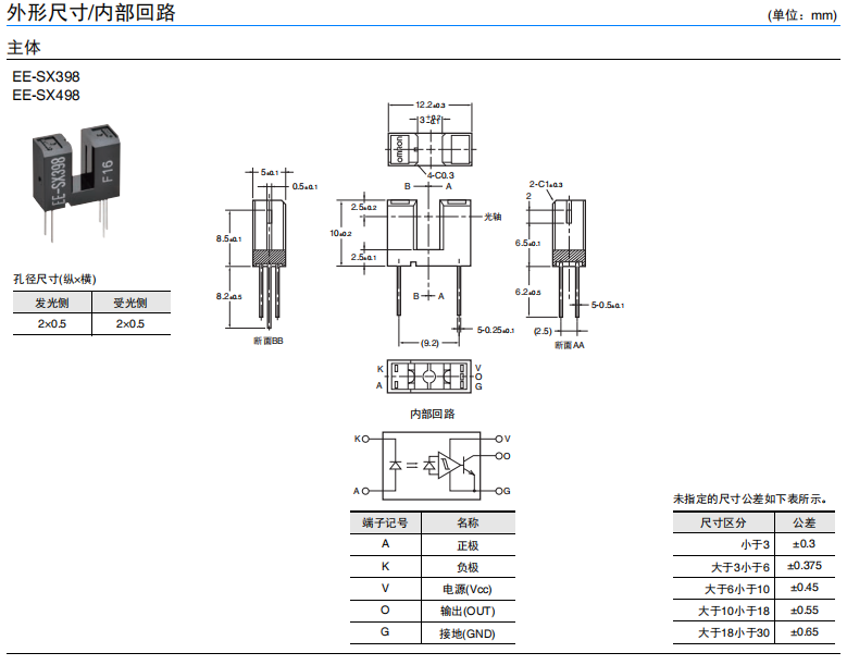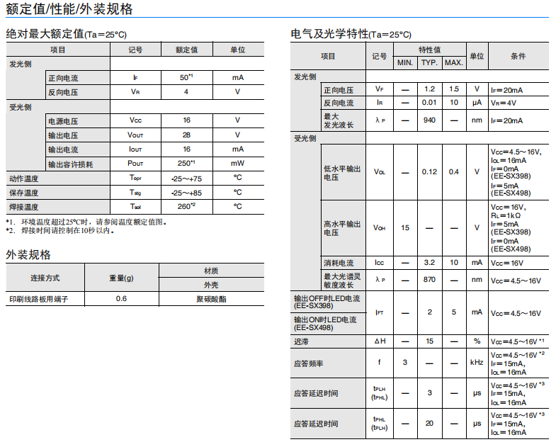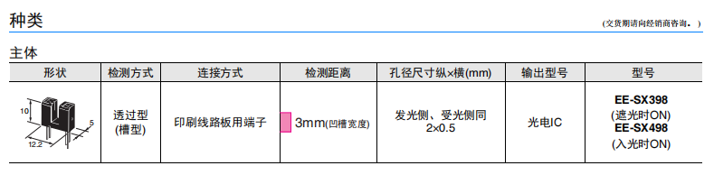 凹槽端子型(槽宽:3mm) • 光电IC输出(分为遮光时ON(EE-SX398)/入光时ON(EE-SX498) 2种类型) • 适用电源电压为DC4.5~16V • 可直接连接C-MOS