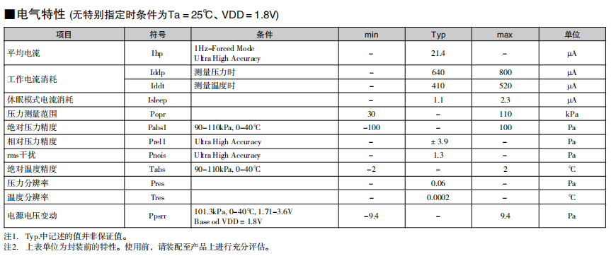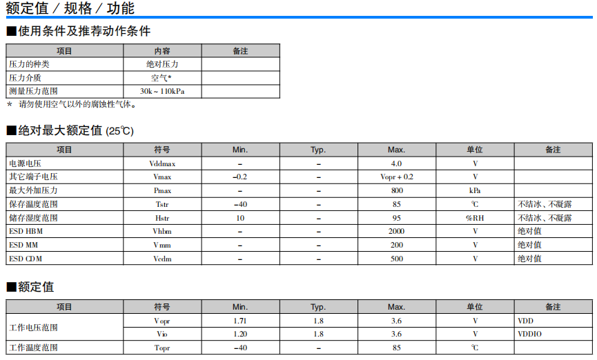 高精度·低消耗电流的小型MEMS绝对压力传感器 高精度地测量气压 内置低干扰的24bit ADC 基于I2C/SPI 接口的数字控制/输出 在自动睡眠模式下实现低消耗电流 单独的补偿系数保存在OTP*中 (* One Time Programmable - ROM)