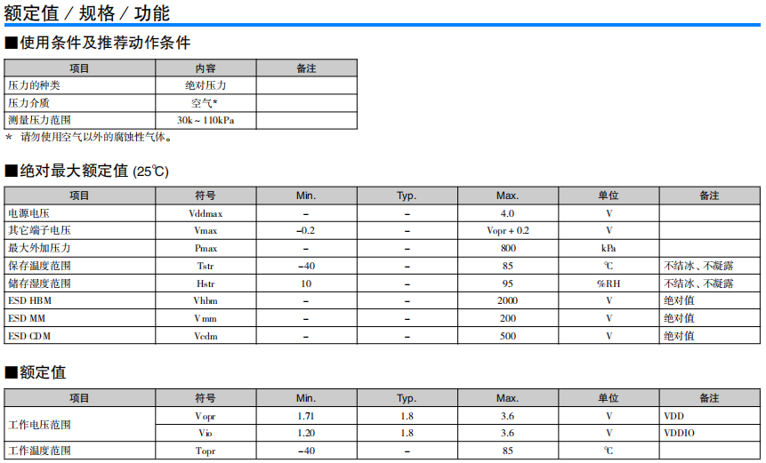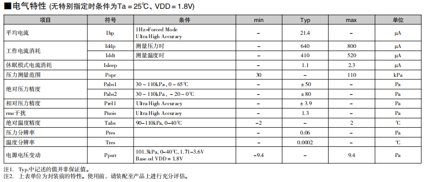 高精度·低消耗电流的小型MEMS绝对压力传感器 高精度地测量气压 内置低干扰的24bit ADC 基于I2C/SPI 接口的数字控制/输出 在自动睡眠模式下实现低消耗电流 单独的补偿系数保存在OTP*中 (* One Time Programmable - ROM)
