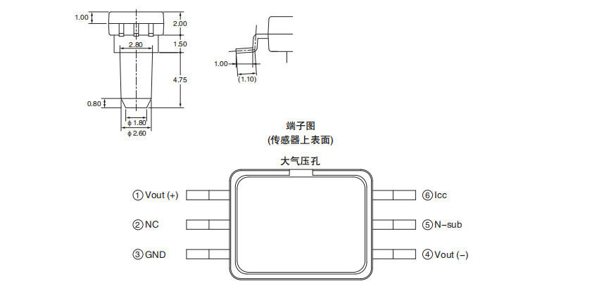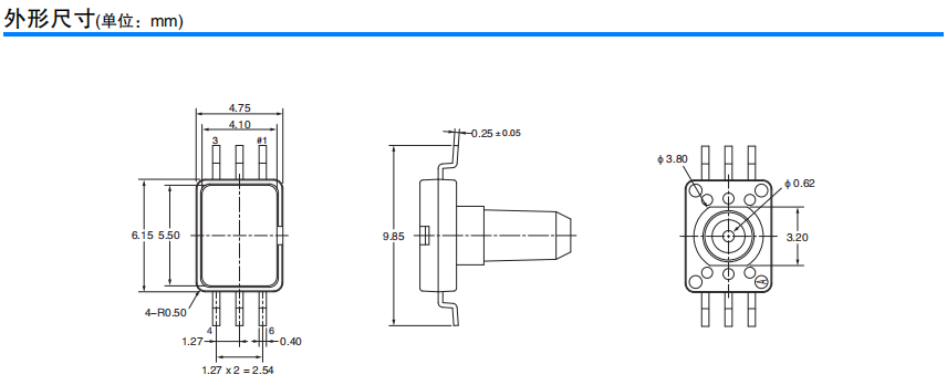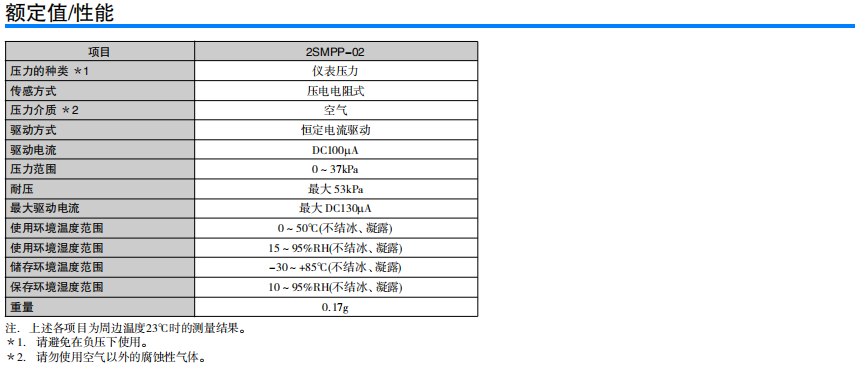 超小型、低功耗的MEMS表压传感器 长6.1mm×宽4.7mm×高8.2mm的超小型。 比电容式压力传感器更优异的电气特性。 测量压力范围为0~37kPa。 偏置电压:-2.5±4mV 量程电压:31.0±3.1mV 0.2mW的低功耗。 受温度影响小。 量程电压:±1.0 %F.S. 偏置电压:±3.0%F.S.
