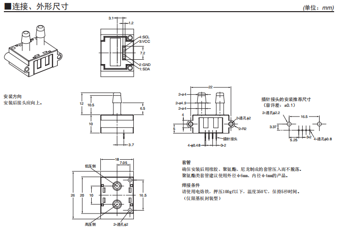 测量范围:0~250Pa 小型、高精度、耐环境性能卓越的差压传感器 ±3%RD的高精度。 具备直线补偿、温度补偿功能。 数字输出(I2C通信)。 高流量阻抗减少旁路配置的影响。