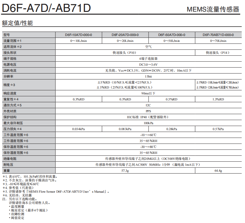 D6F-A7/-N7/-L7燃气流量欧姆龙传感器