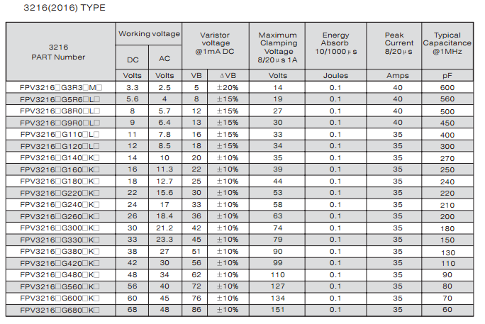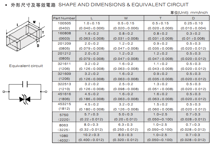 特征: 1、叠层片式陶瓷结构。 2、无引线。 3、温度范围:-55℃~+125 ℃。 4、工作电压范围V w(dc)=3.3~ 615V。 5、具有双向限制特性,适合ESD保护。 6、漏电流非常小。 7、寄生电感小、响应速度快(响应时间少于0.5ns)。 8、优良的温度系数。 9、良好的焊接性能(端电极为三层电镀)。 应用: 1、防止过电压:当施加的电压升高到压敏电压时,压敏电阻器的电流急剧上升,被保护设备的浪涌电压迅速减小,从而使装有压敏电阻器的设备抗浪涌噪声能力达到相应要求。压敏